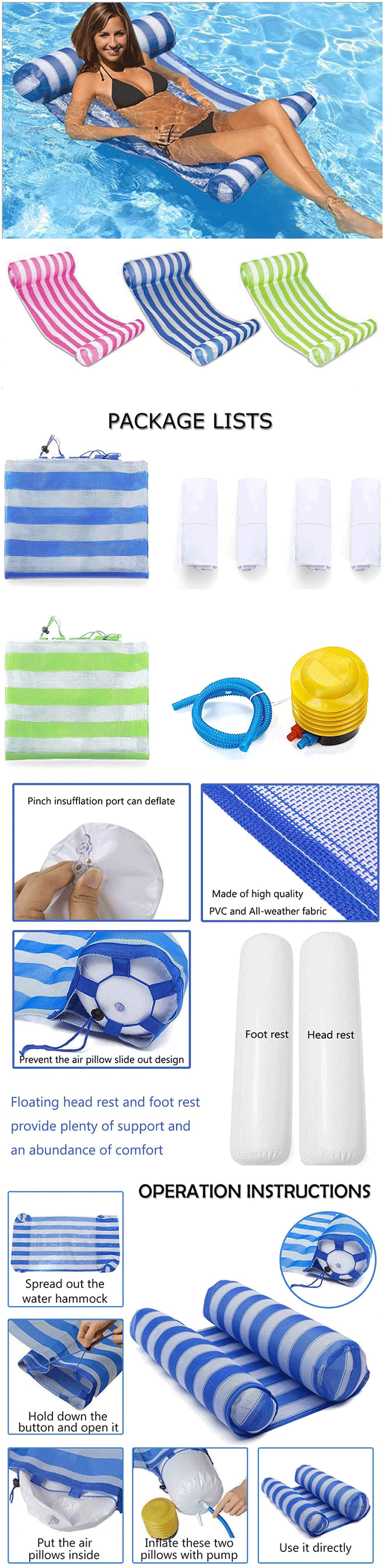 ▪ Keep cool The inflatable water hammock allows your body to be partly submerged in the water while keeping your head and knee afloat. You can float on water, enjoy the sunshine, and relax your body.