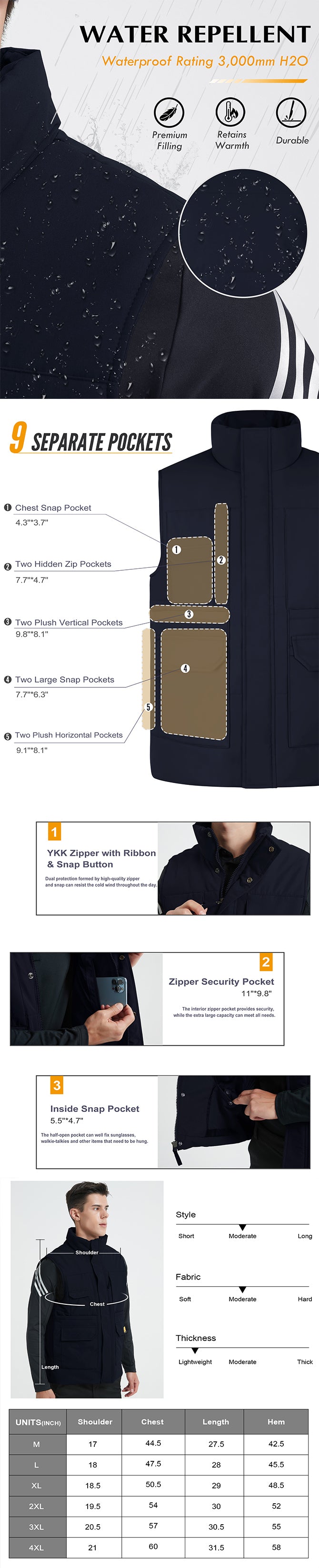 【Windproof & Water Resistant】Men's windproof winter vest with padded stand-up collar design, front closure with snaps and full YKK zipper closure to keep out the cold wind. The water resistant puffer vest shell is made of high-quality Oxford cloth, so you won't get wet in a light rain for a short time.