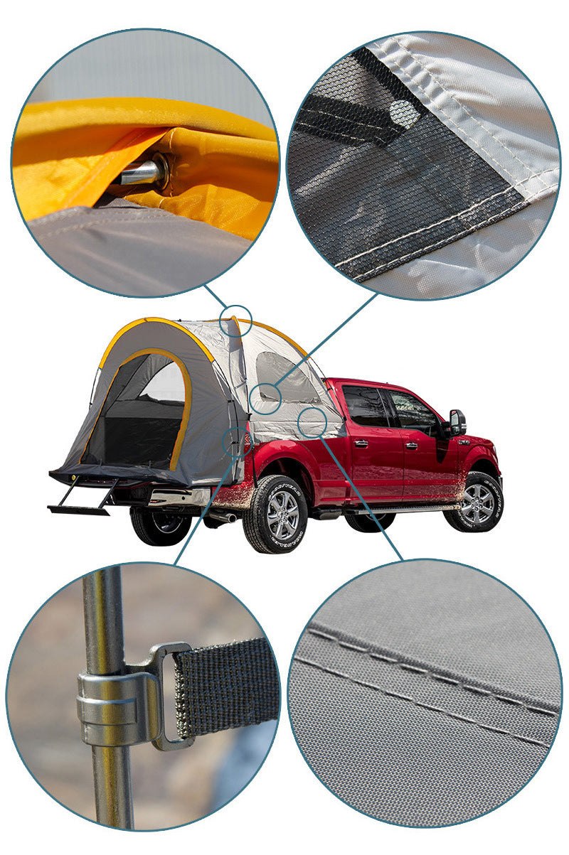 【Waterproof & Durable】 Made of 210D oxford polyester with a PU2000mm water-resistant coating, when it is rainy and windy ountside, this pickup truck bed camping tent will protect you from the wind and rain. Poles are made of φ8.5mm fiberglass which is not only resistant to corrosion but also has high tensile strength.